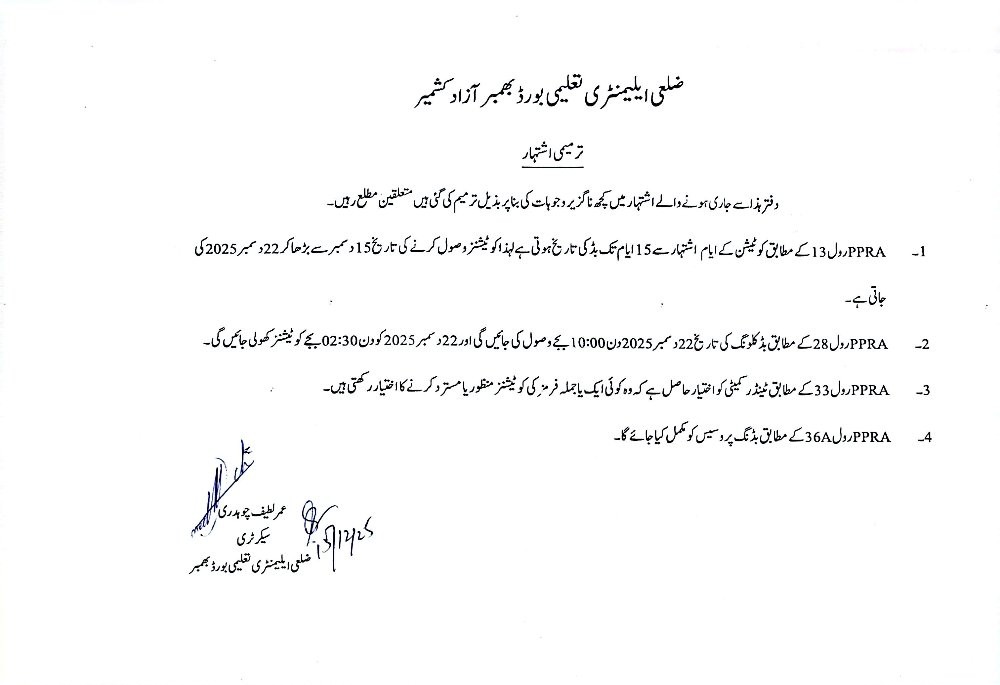 05-12-2025 | 22-12-2025 | Close | Education Department | Elementary Education Board Bhimber | Download File