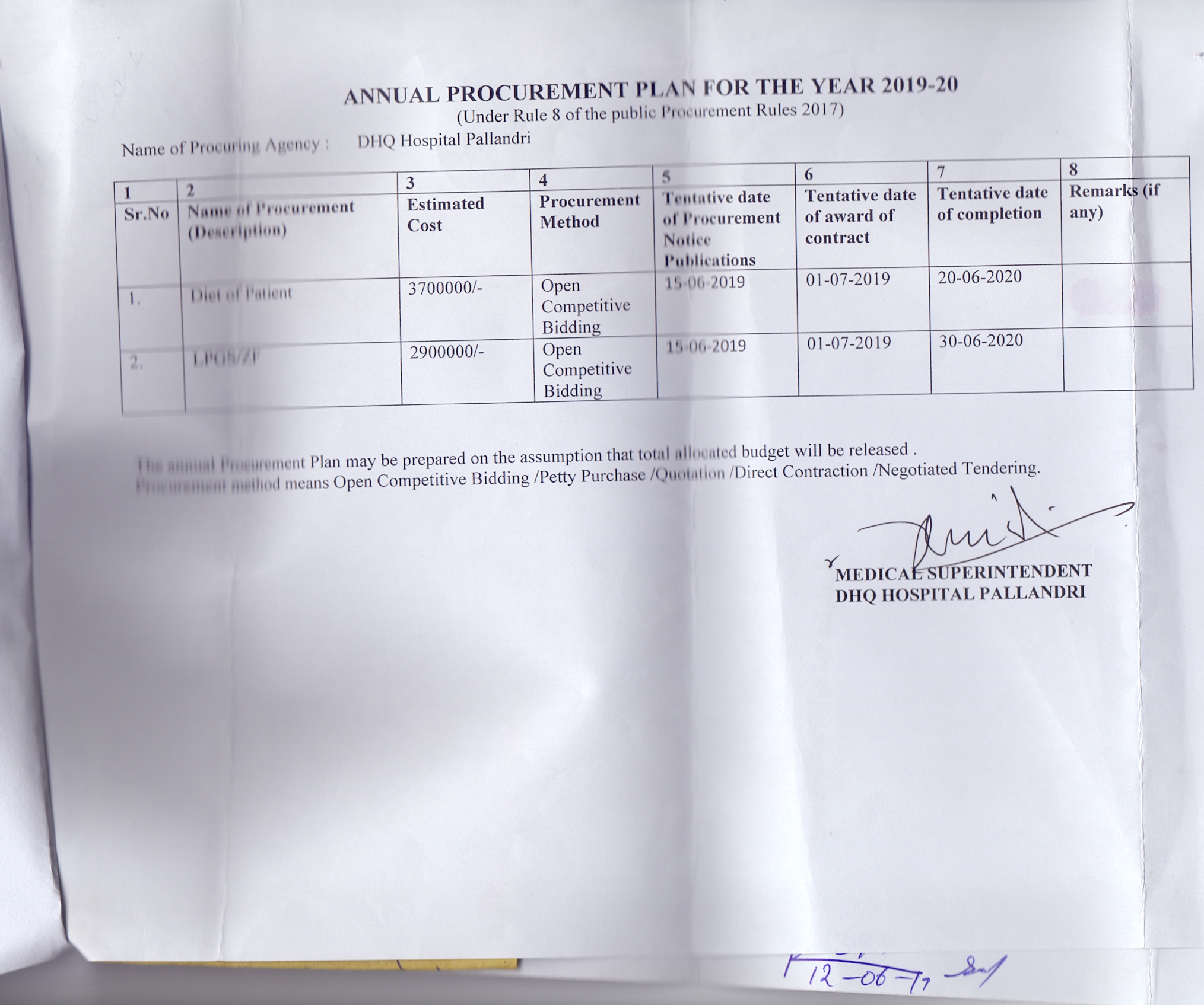 | Annual Procurement Plan (DHQTH) | 2019-20 | Health Department | Health Mirpur | Download File |