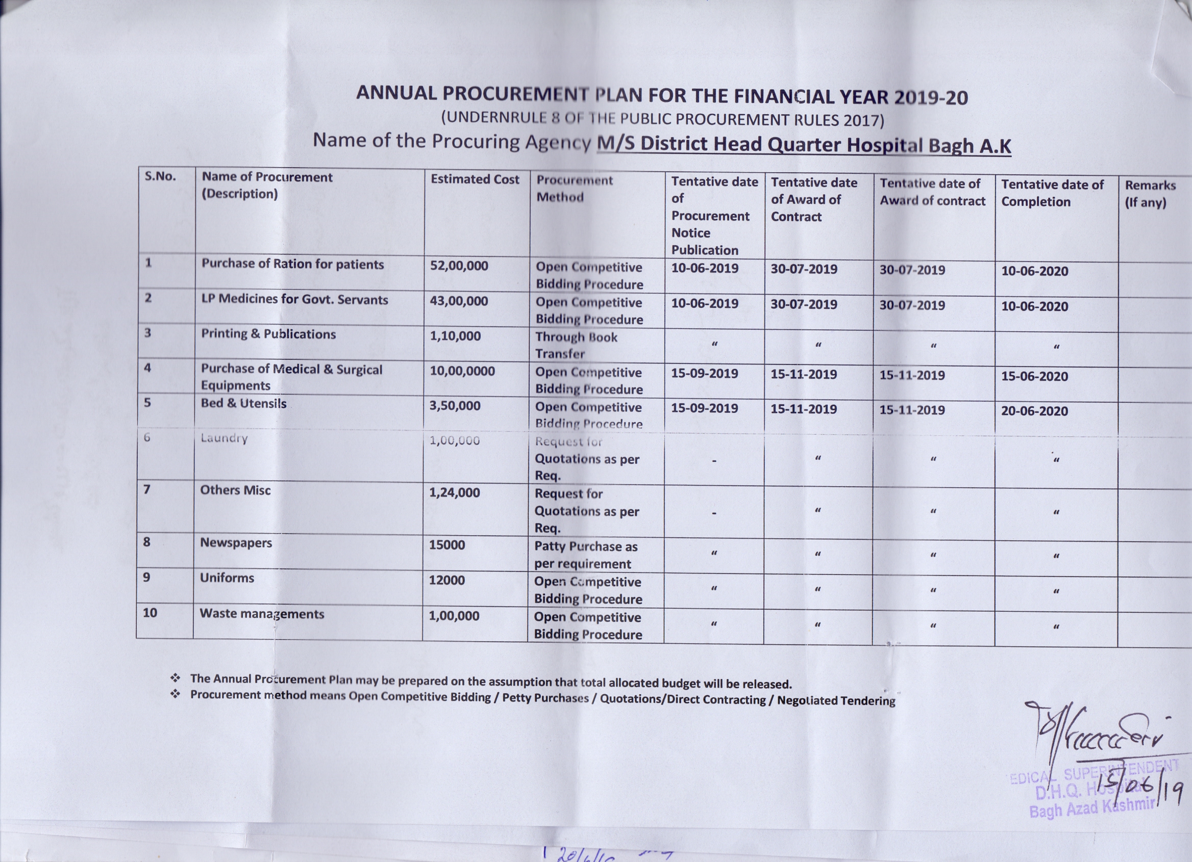 | Annual Procurement Plan (DHQ) | 2019-20 | Health Department | Health Bhimber | Download File |
