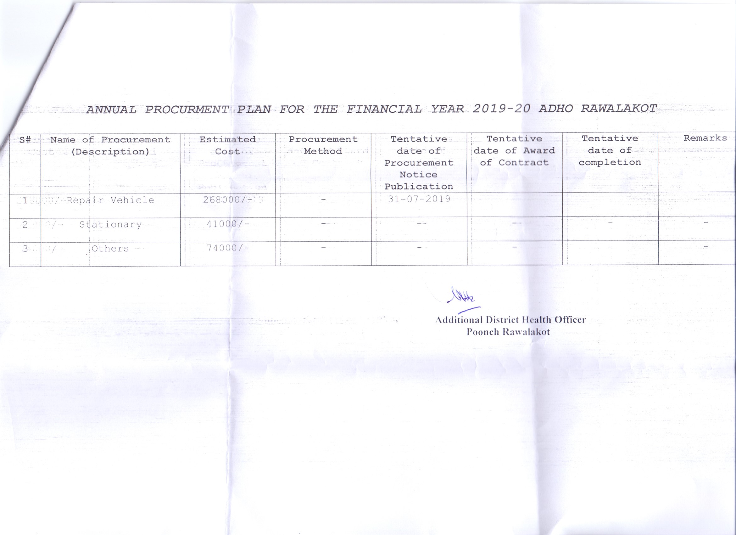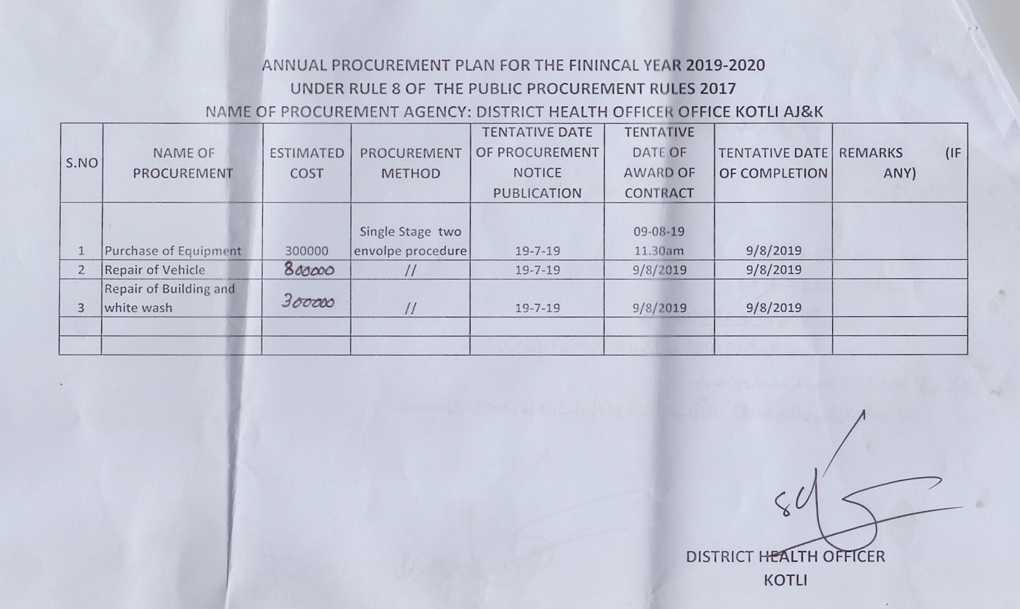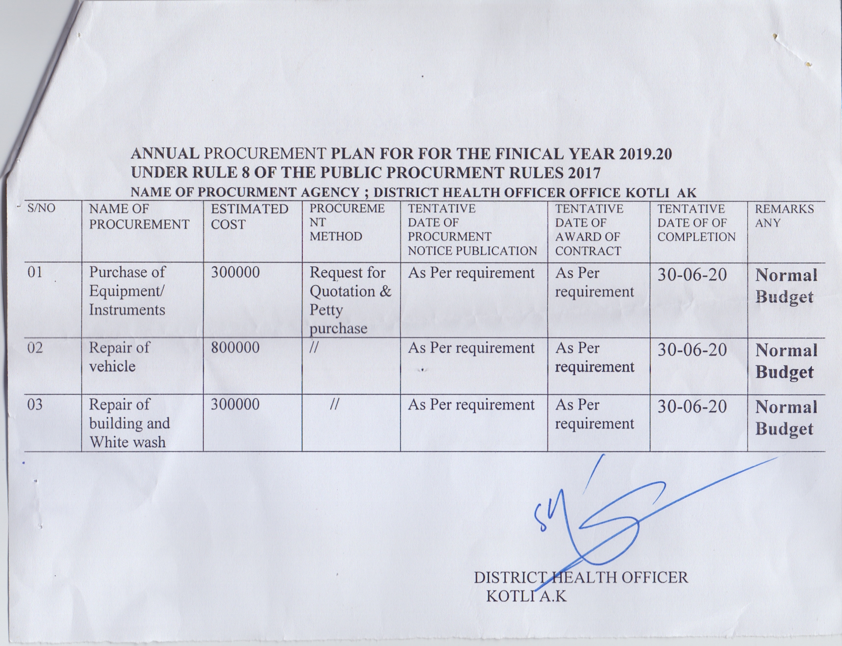 | Annual Procurement plan (DHO) | 2019-20 | Health Department | Health Kotli | Download File |