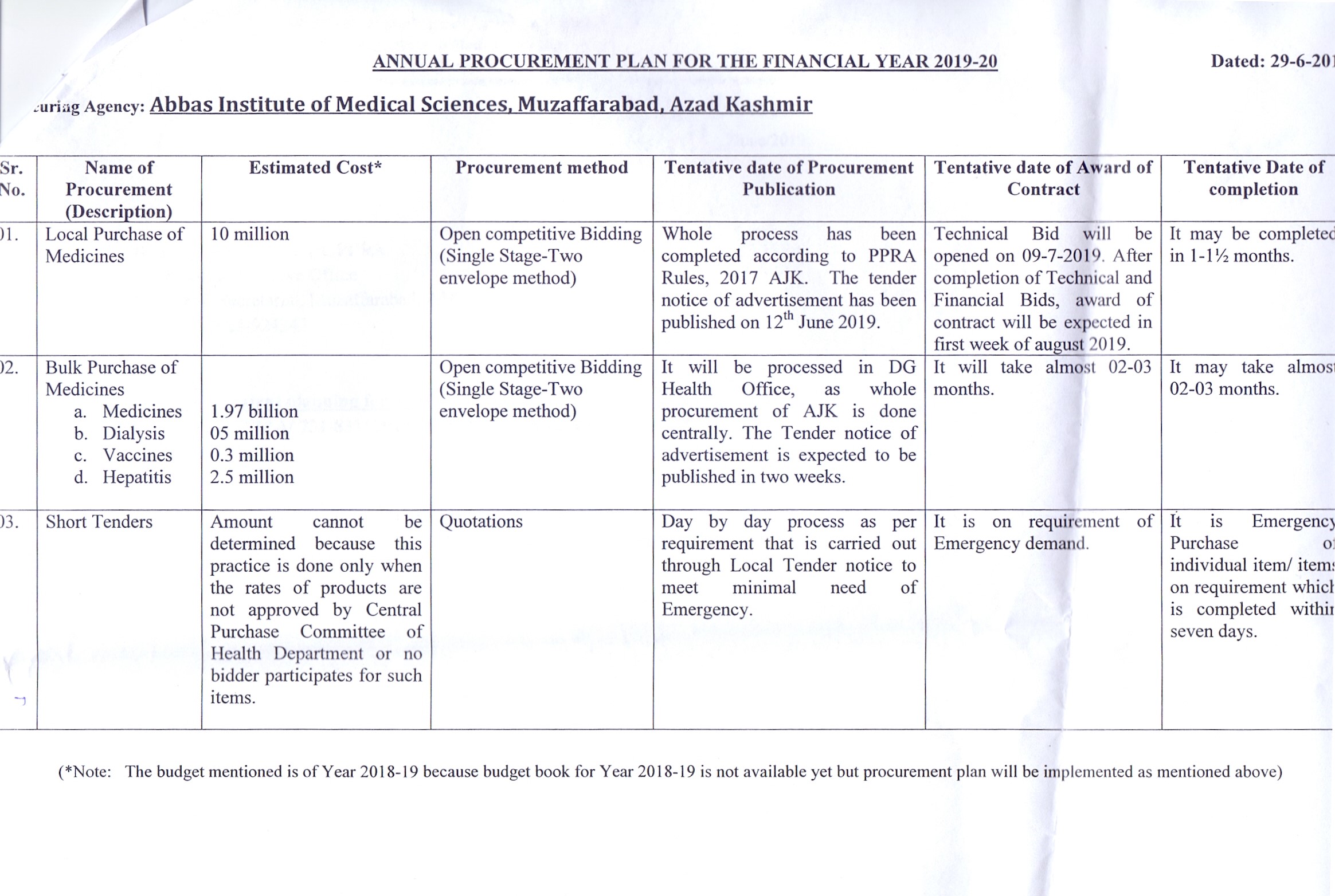 | Annual Procurement Plan (Aims) | 2019-20 | Health Department | Health Muzaffarabad | Download File |