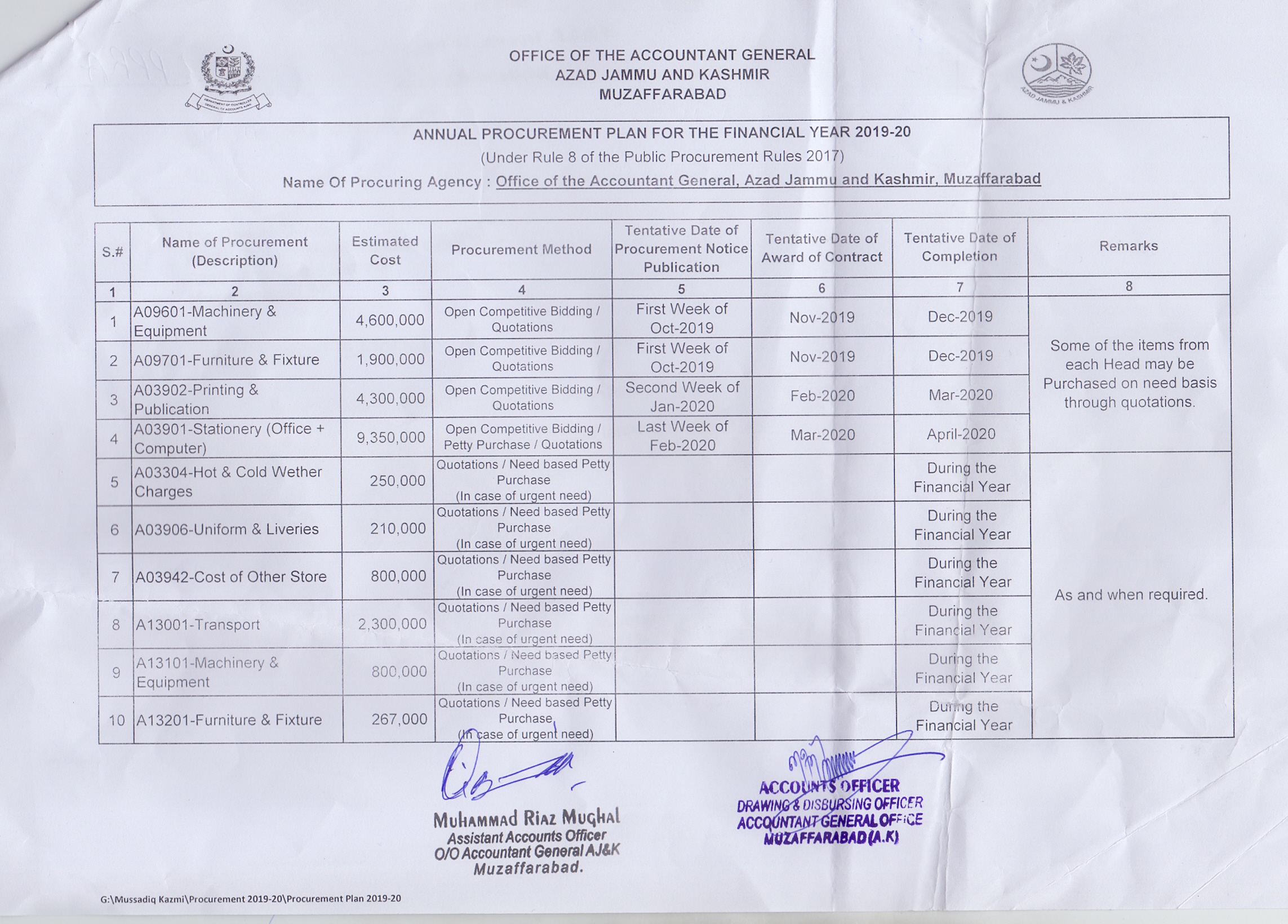| Annual Procurement Plan | 2019-20 | Accountant General Office | AG OFFICE MUZAFFARABAD | Download File |