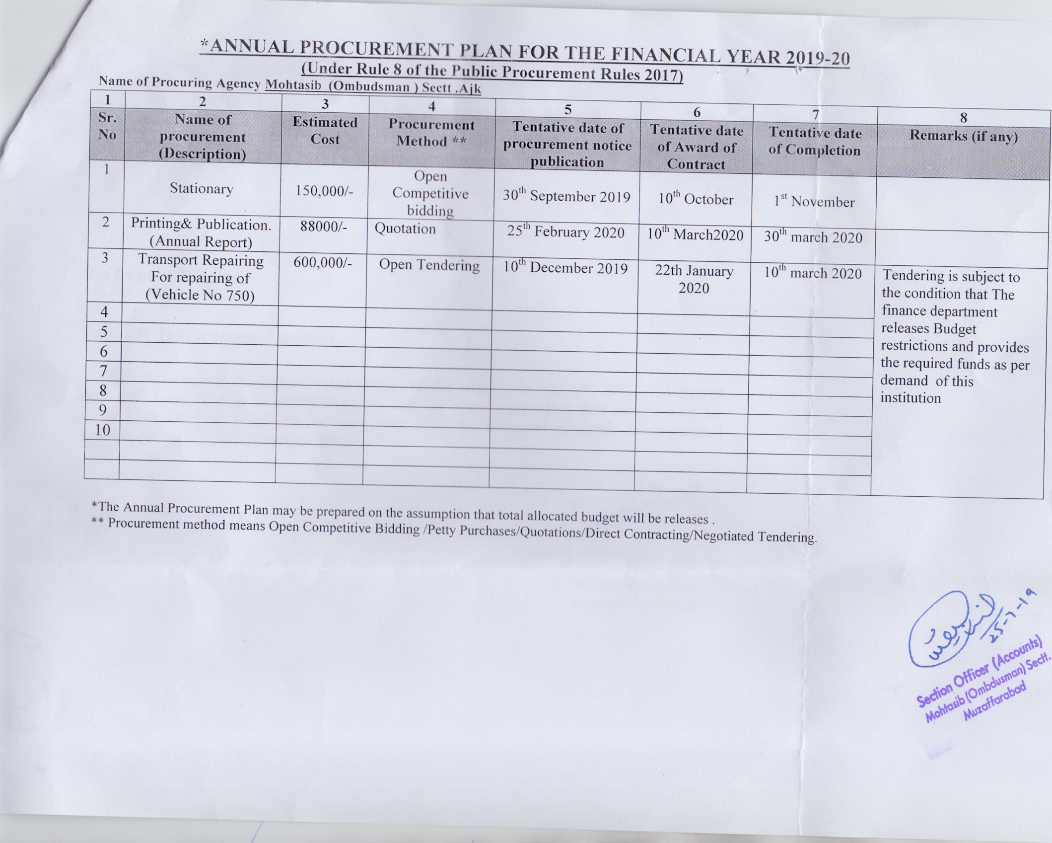 | Annual Procurement Plan (Mohtasib Secretariat) | 2019-20 | Mohtasib | Mohtasib Muzaffarabad | Download File |