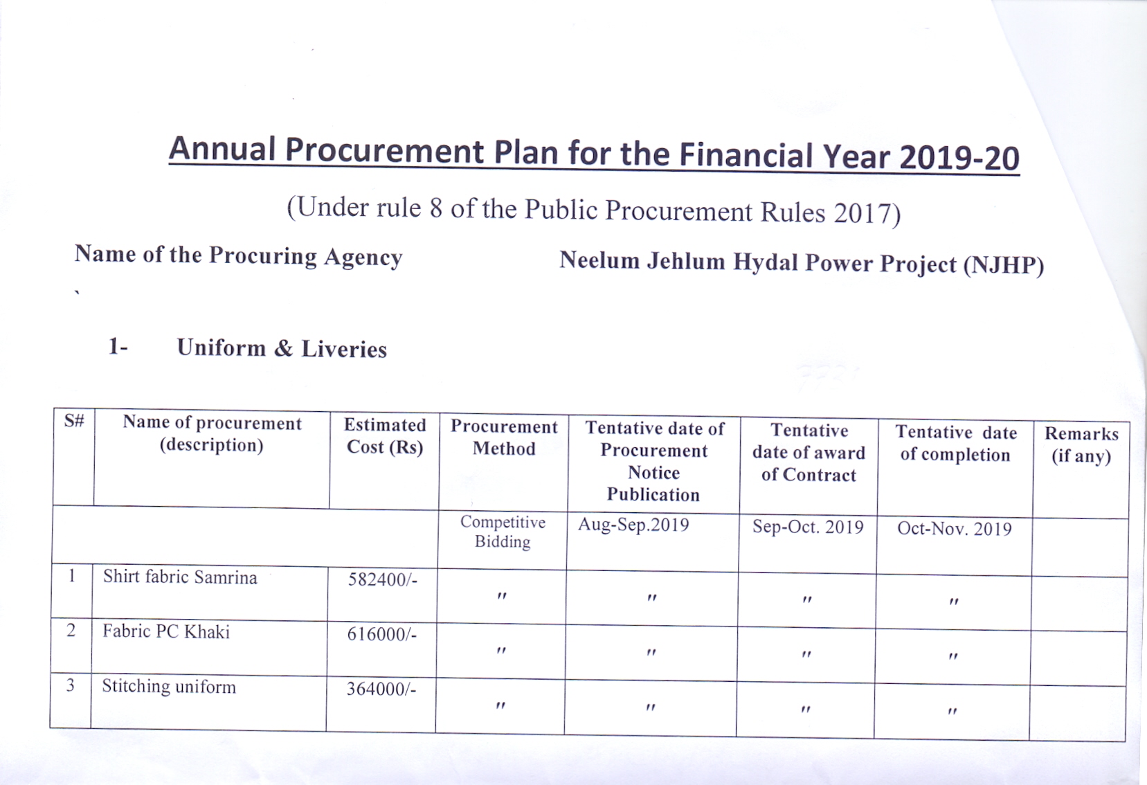 | Annual Procurement Plan (Neelum Jhelum Hydel Power Project) | 2019-20 | AJK Police Department | Muzaffarabad Police | Download File |