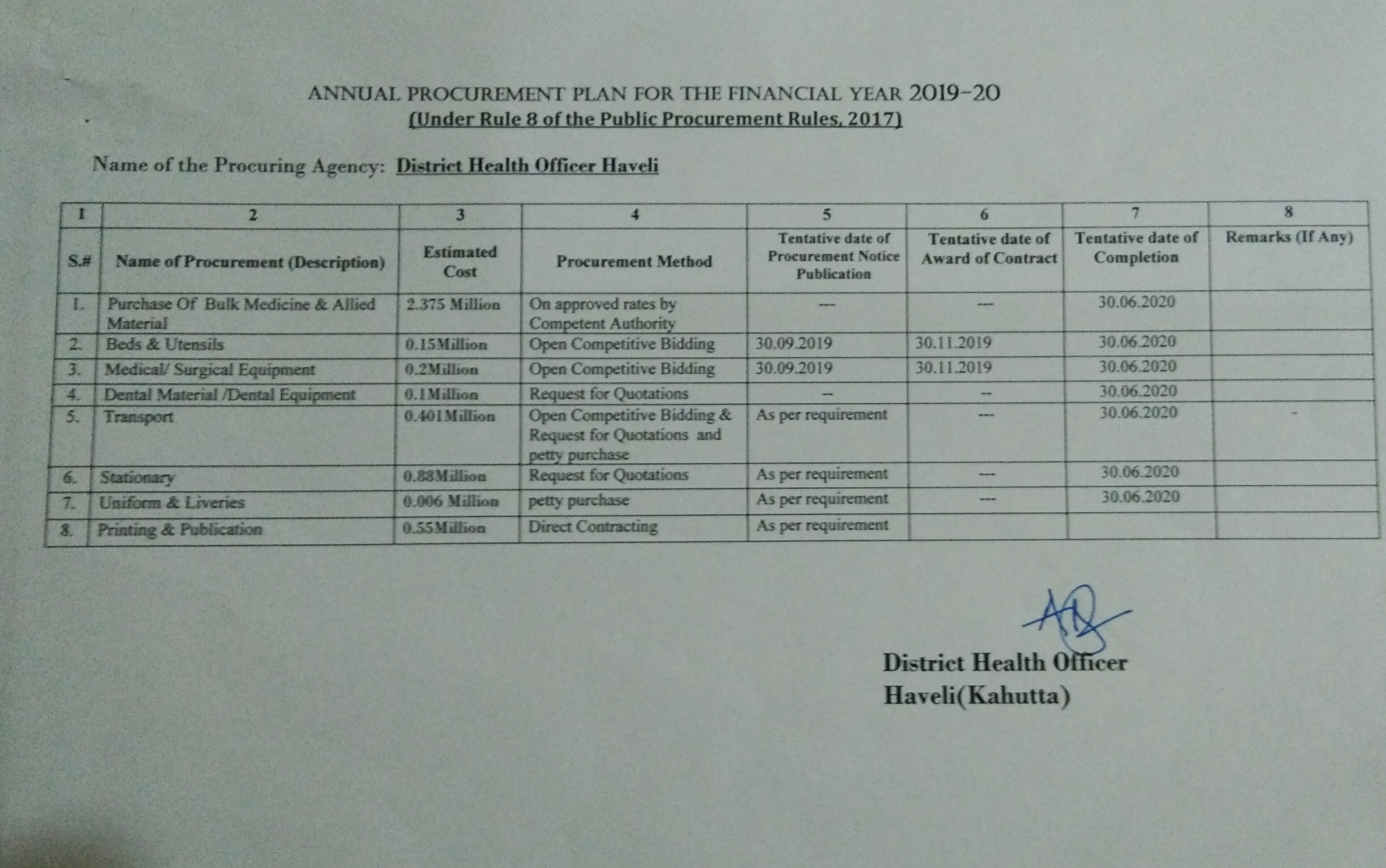 | Annual Procurement Plan (Kahutta) | 2019-20 | Health Department | Health Haveli | Download File |