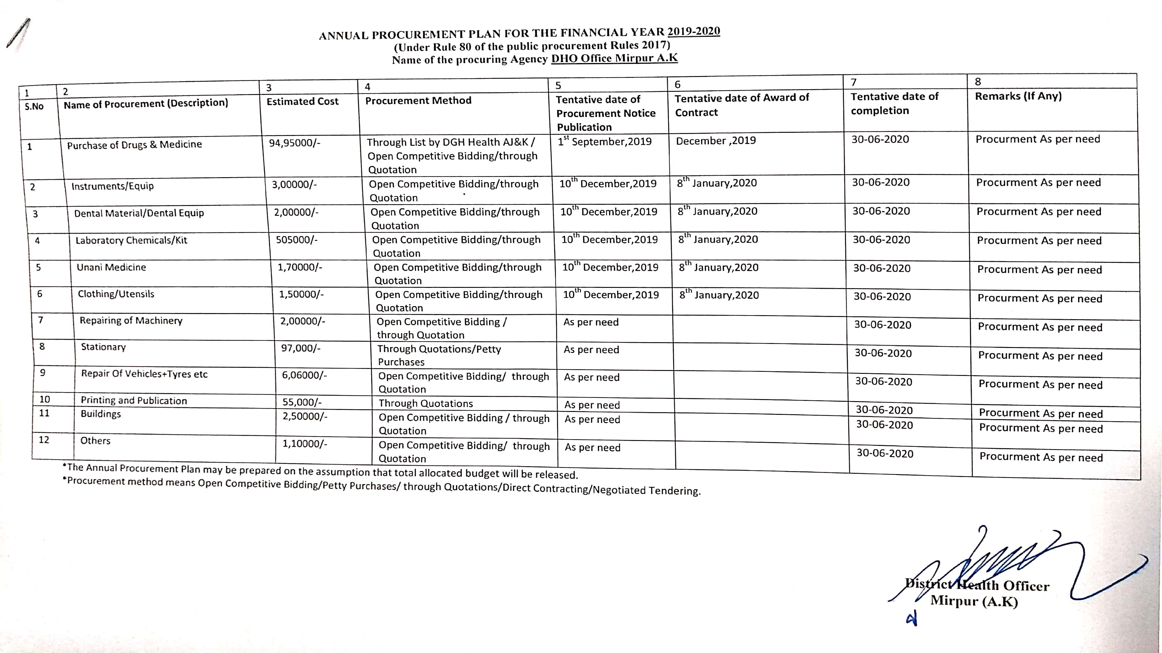 | Annual Procurement Plan (DHO) | 2019-20 | Health Department | Health Mirpur | Download File |