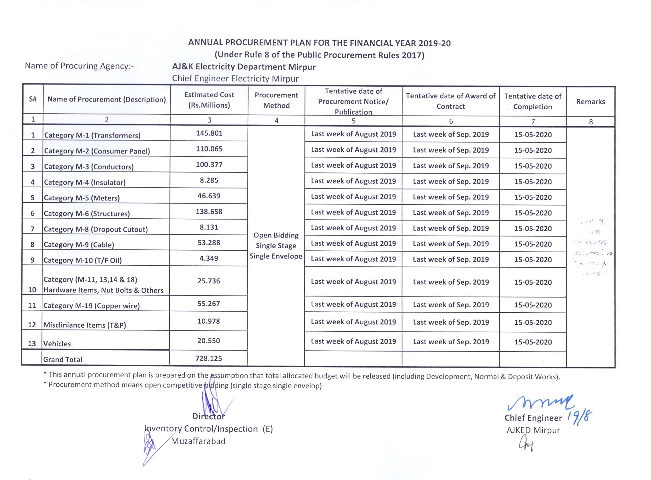 | Annual Procurement Plan | 2019-20 | Energy and Water Resource | Electricity Mirpur | Download File |