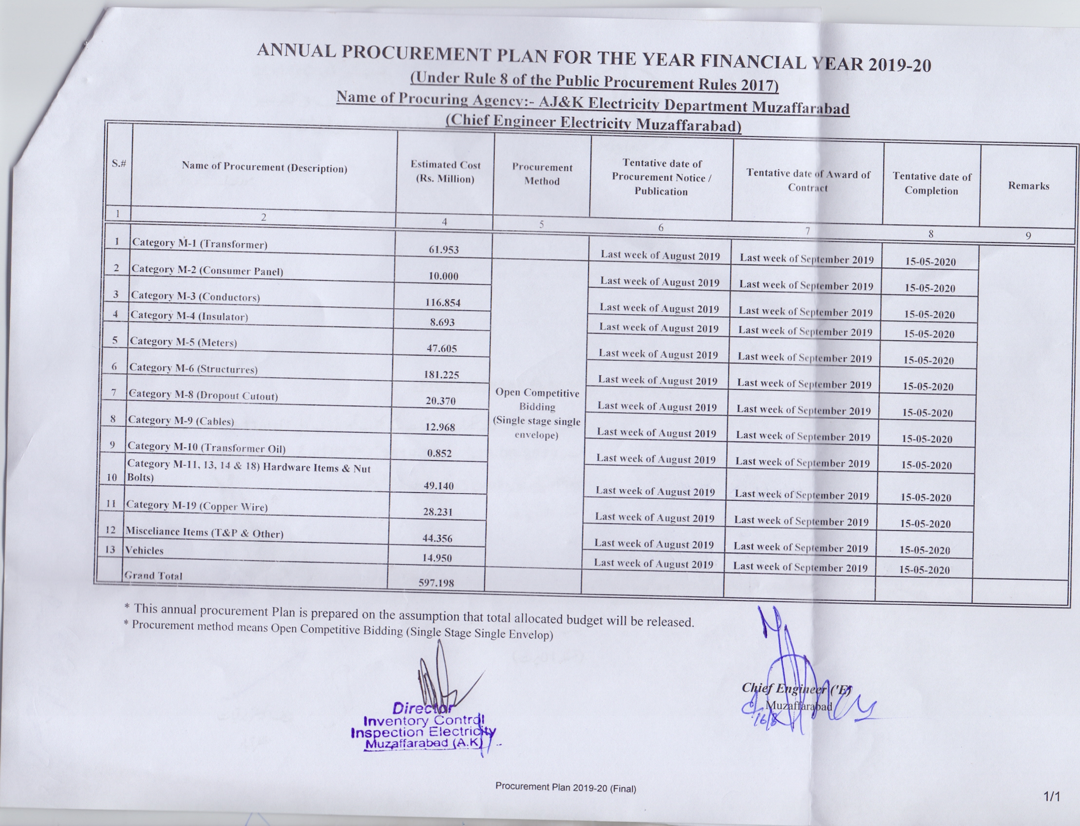 | Annual Procurement Plan | 2019-20 | Energy and Water Resource | Electricity Muzaffarabad | Download File |
