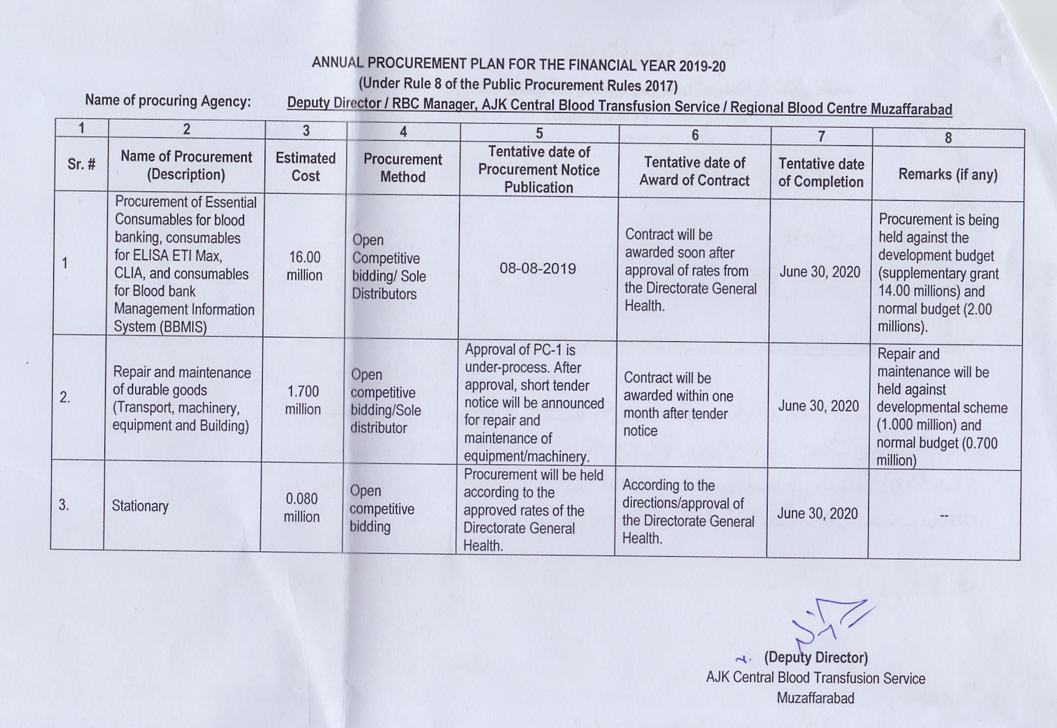 | Annual Procurement Plan (Central Blood Transfusion Service) | 2019-20 | Health Department | Health Muzaffarabad | Download File |