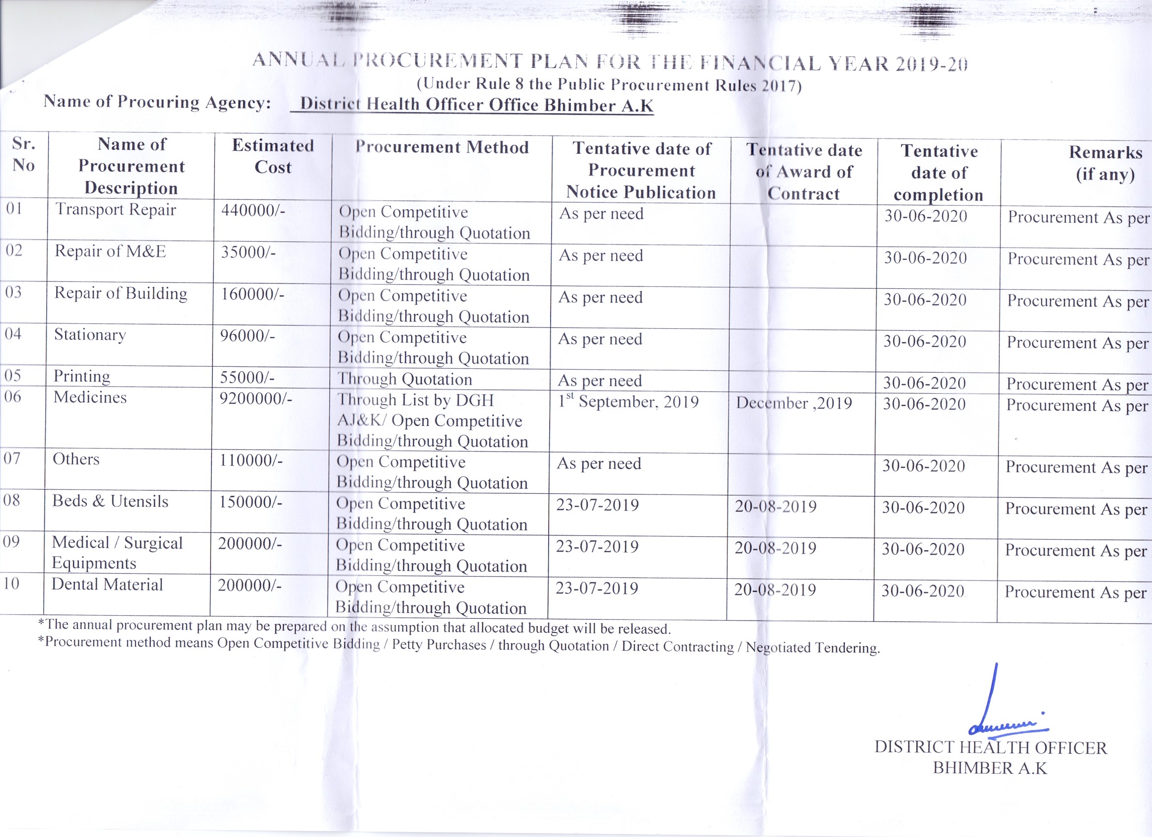 | Annual Procurement Plan (DHO) | 2019-20 | Health Department | Health Bhimber | Download File |