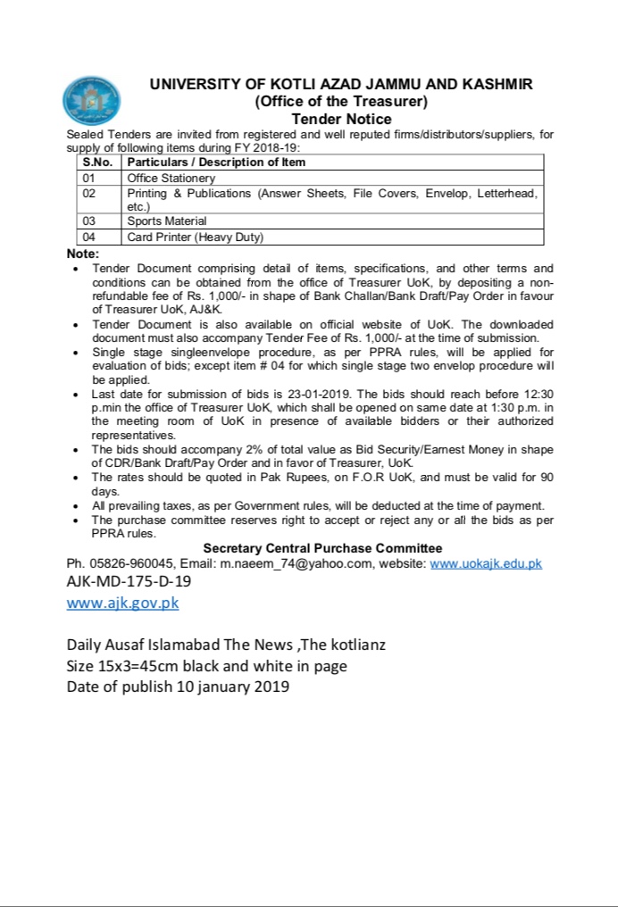 10-01-2019 | 23-01-2019 | Close | Education Department | University of Kotli | Download File |