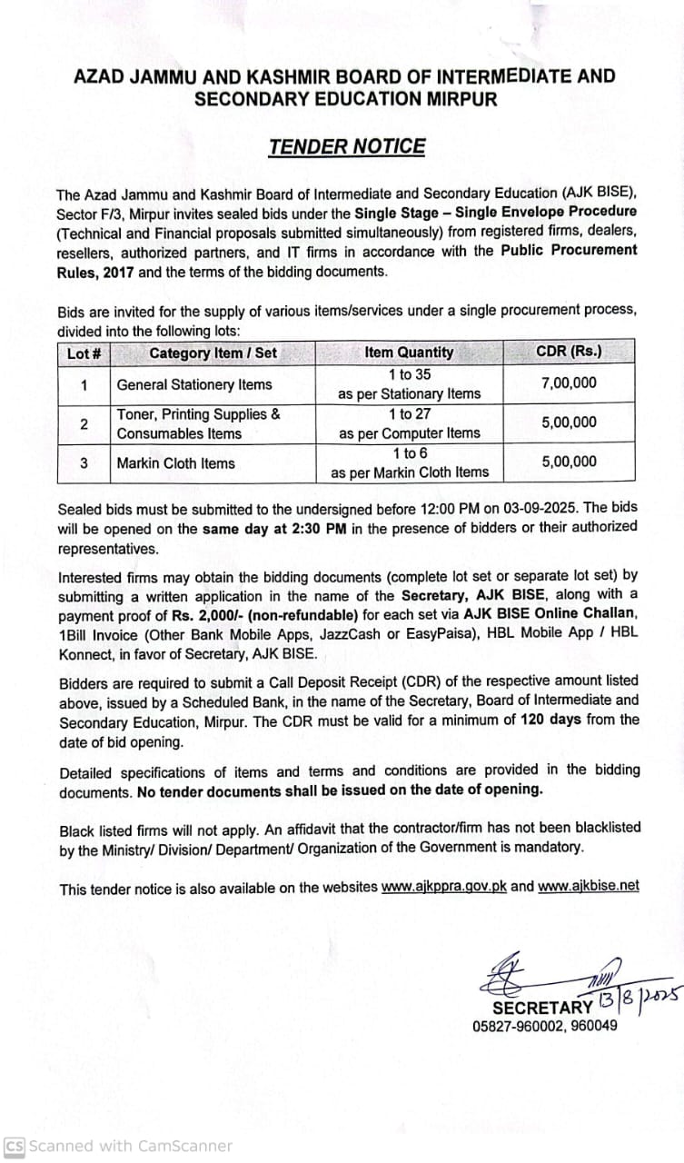 13-08-2025 | 03-09-2025 | Close | Education Department | AJK BISE | Download File